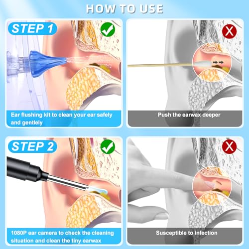 【2 in 1 Safe & Simple Ear Cleaning Kit】 It is a perfect ear care product kit to clean your ears safely,effectively and gently. Firstly, Our Irrigation tool gently cleans your ears and remove earwax, dirt, and debris. Secondly,you can use the 1080P ear camera to check whether the ear is cleaned or not then clean more.