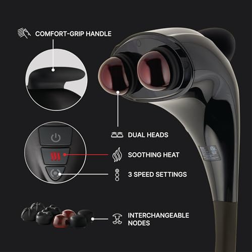 Homedics Handheld Back Massager, Dual Heated Nodes, Neck, and Body Percussion Massager with Interchangeable Nodes to Release Back, Neck, Shoulder Leg and Foot Tension