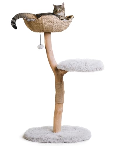 BEAUTIFUL & UNIQUE DESIGN: Unlike most cat furniture, this wood and wicker cat tree tower will enhance the look of your home and provide a comfy place for kitties up to 15 Pounds to lounge in. It includes a beautifully crafted, one-of-a-kind trunk that holds both a hand-woven wicker basket (with machine washable cushion included) and a cushioned platform step. It’s perfect for your kitty to nap happily while you can enjoy looking at a beautiful piece of art that adds to your home’s aesthetics.