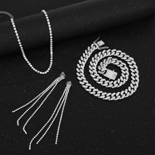 Specification: NEWITIN 13 Pieces Silver Jewelry Set for Women Stainless Steel Cuban Link Necklaces Bracelets Earrings Watch Ring Bling Cubic Zirconia Cuban Jewelry Set for Women Men
