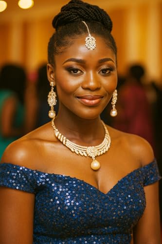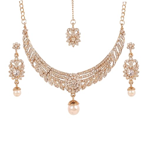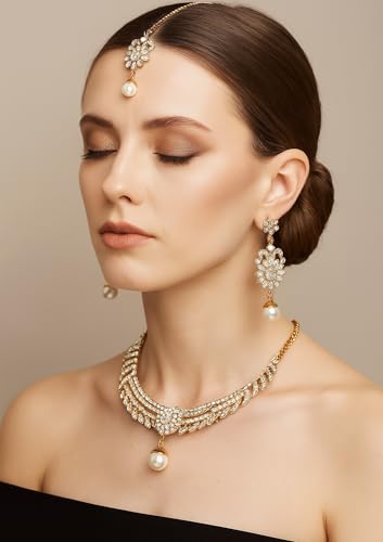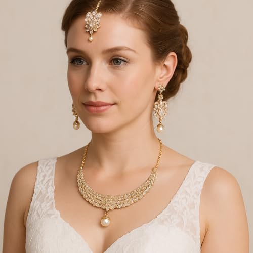 Specification: Touchstone Indian Bollywood Modern Style White Rhinestone Faux Pearls Desi Wedding Designer Jewelry Necklace Set in Gold Tone for Women.
